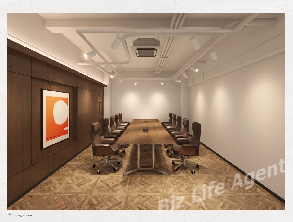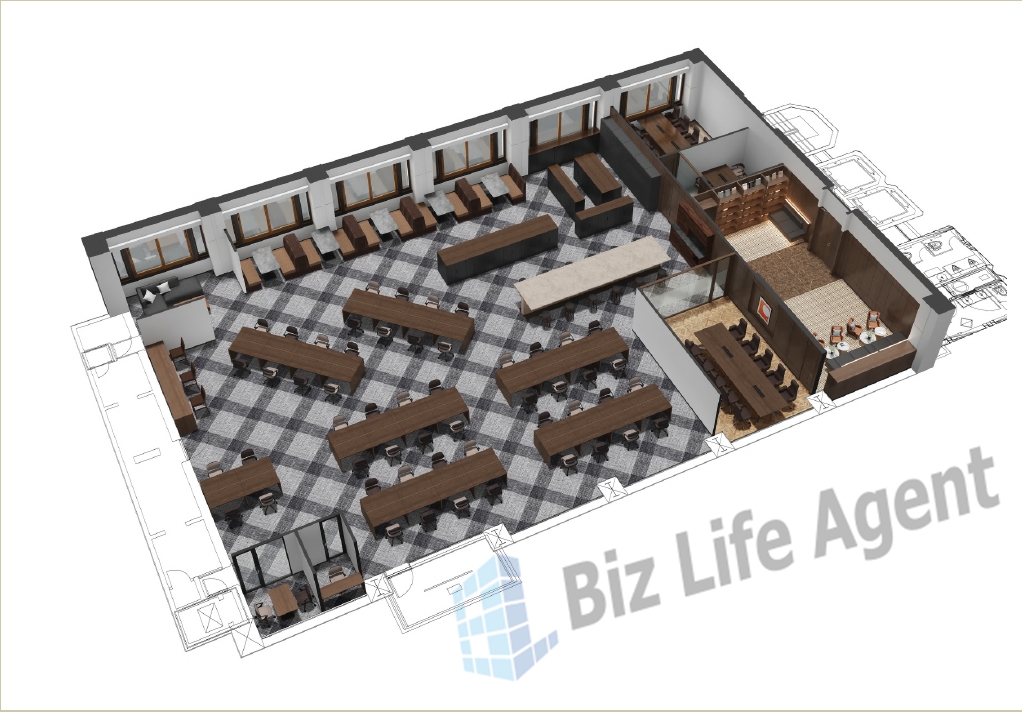 天井が抜かれている空間に高級感のある木目仕上げとなり、エントランス・待合スペース・ラウンジスペースを備え、会議室は4名・8名・10名の3室を設け人数に応じてご利用できます。また約100坪の広さの執務室となり、お好きな什器をレイアウトしていただけます。想定プランとしては、執務52席にファミレスブースを5ブース、リフレッシュスペースに加え、カウンタースペースを設け解放感のある室内を演出しております。